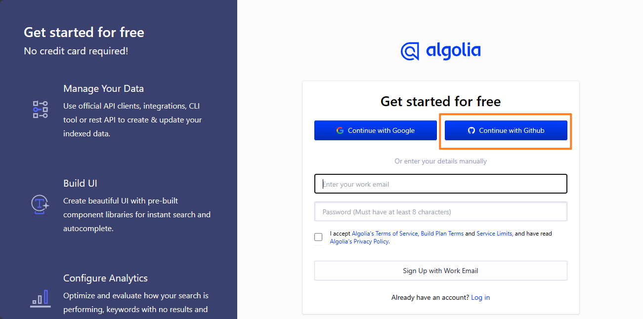 使用Github账号登录Algolia 官网,如果你会魔法,请大胆用google账号